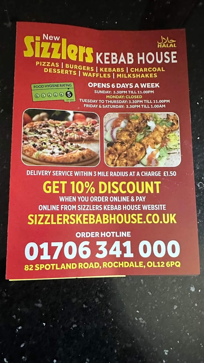 At Sizzlers Pizza & Kebab House (Rochdale), the menu offers a delicious variety of mouth-watering options perfect for any craving. Whether you're in the mood for a hearty pizza with all your favorite toppings or a sizzling kebab packed with flavor, there's something to satisfy every taste. From classic margherita pizzas to more adventurous choices like spicy chicken kebabs, the options are as diverse as they are tempting. Each dish is made with high-quality ingredients, ensuring that every bite is a flavorful experience. With a cozy atmosphere and fast, friendly service, this spot is ideal for casual dining with family and friends. Explore the menu and enjoy the perfect blend of comfort and taste at Sizzlers Pizza & Kebab House!